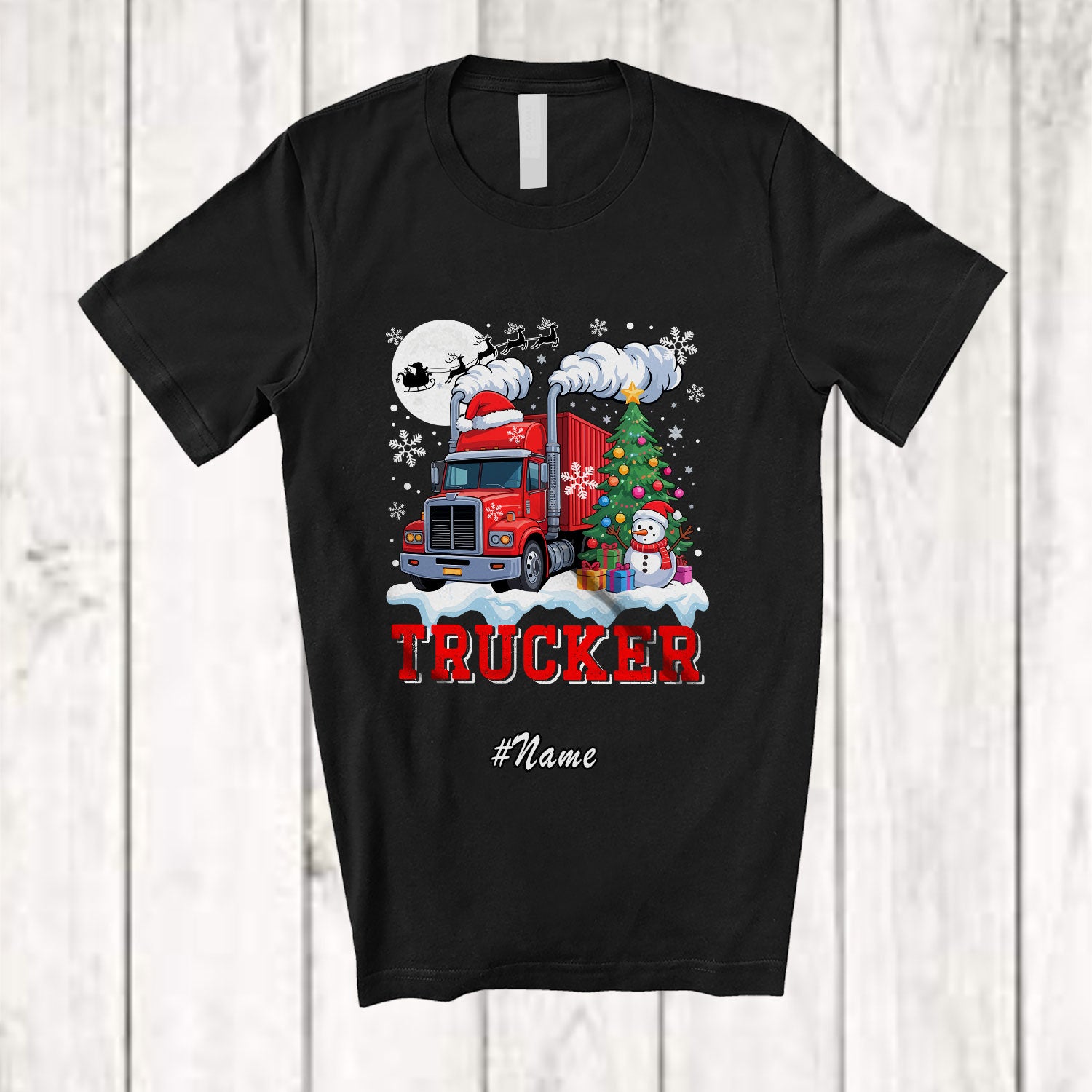 • Personalized Custom Name Trucker With Christmas Tree Snowman; Awesome X-mas Jobs Proud T-Shirt. This cotton t-shirt is a durable staple product with a classic fit. One of the most popular items, it has a relaxed style made for everyday and casual wear.