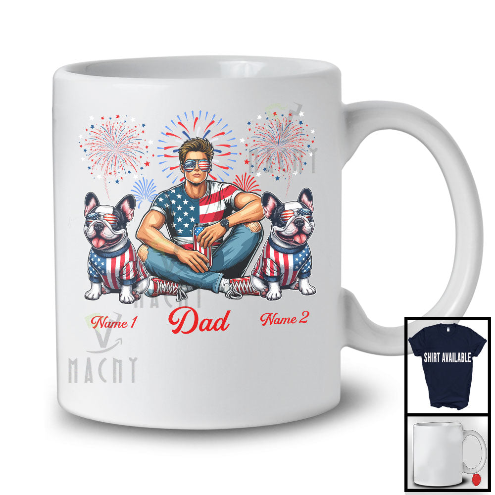 Personalized Dad With Two Custom Name French Bulldog, Amazing 4th Of July Fireworks Patriotic T-Shirt