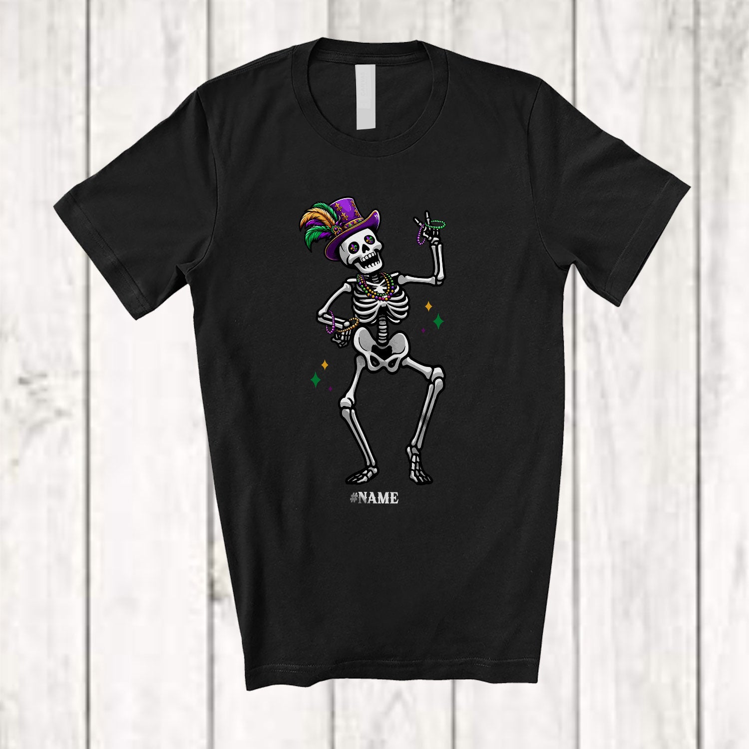 • The Personalized Dancing Skeleton; Humorous Mardi Gras Skeleton Wearing Jester Hat Beads; Family T-Shirt destined to impress, and priced at only $12.95, for a limited time.
