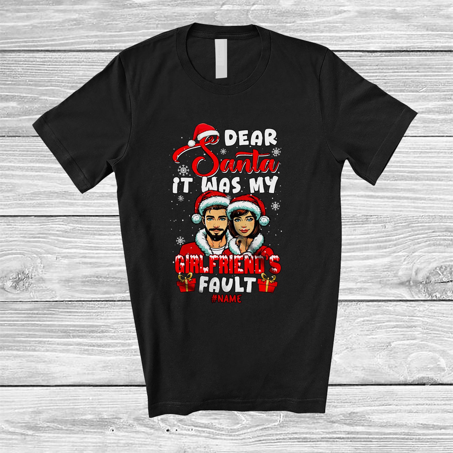 • Personalized Dear Santa It Was My Girlfriend's Fault; Fantastic Christmas Santa Custom Name Couple T-Shirt. This cotton t-shirt is a durable staple product with a classic fit. One of the most popular items, it has a relaxed style made for everyday and casual wear.