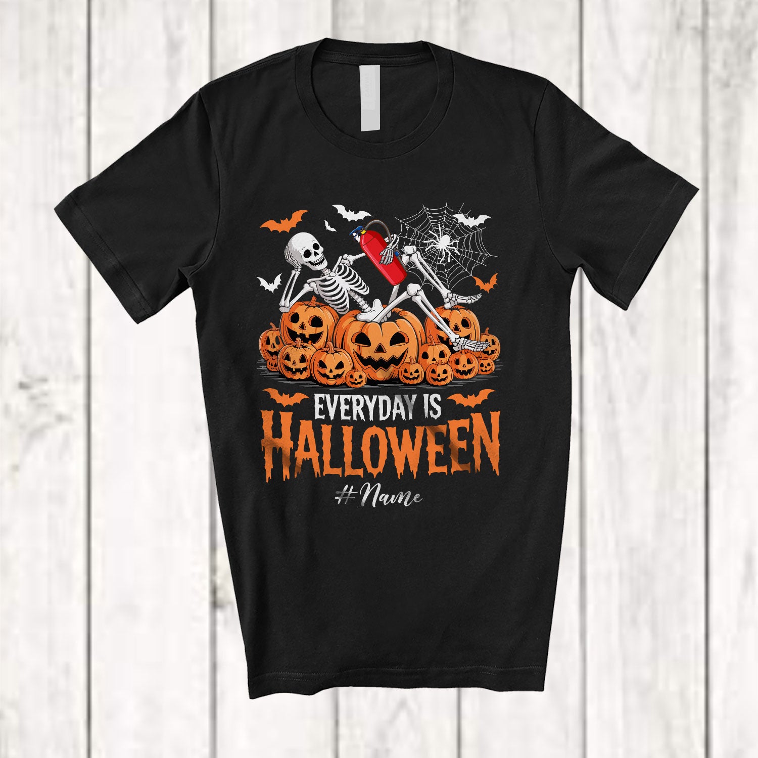 Personalized Everyday Is Halloween; Scary Custom Name Skeleton Tired Firefighter Pumpkins T-Shirt. This cotton t-shirt is a durable staple product with a classic fit. One of the most popular items, it has a relaxed style made for everyday and casual wear.