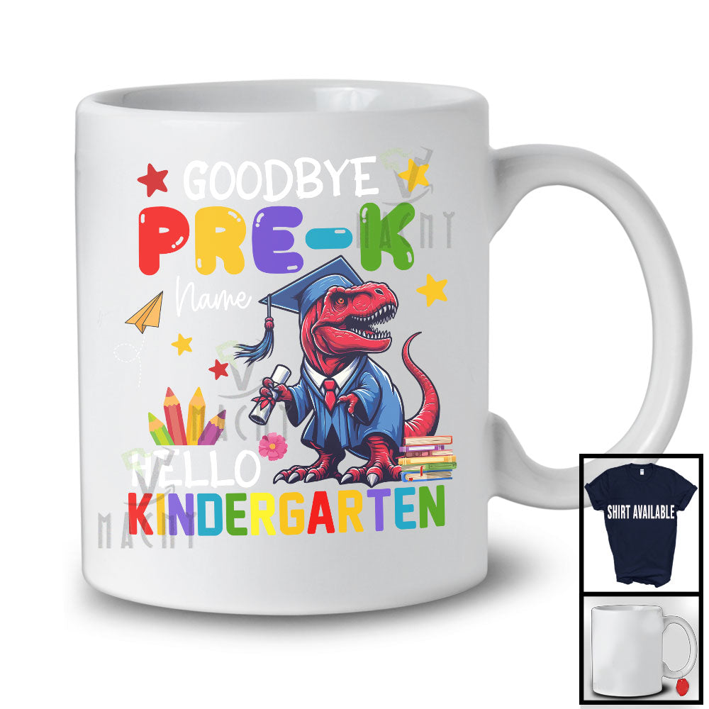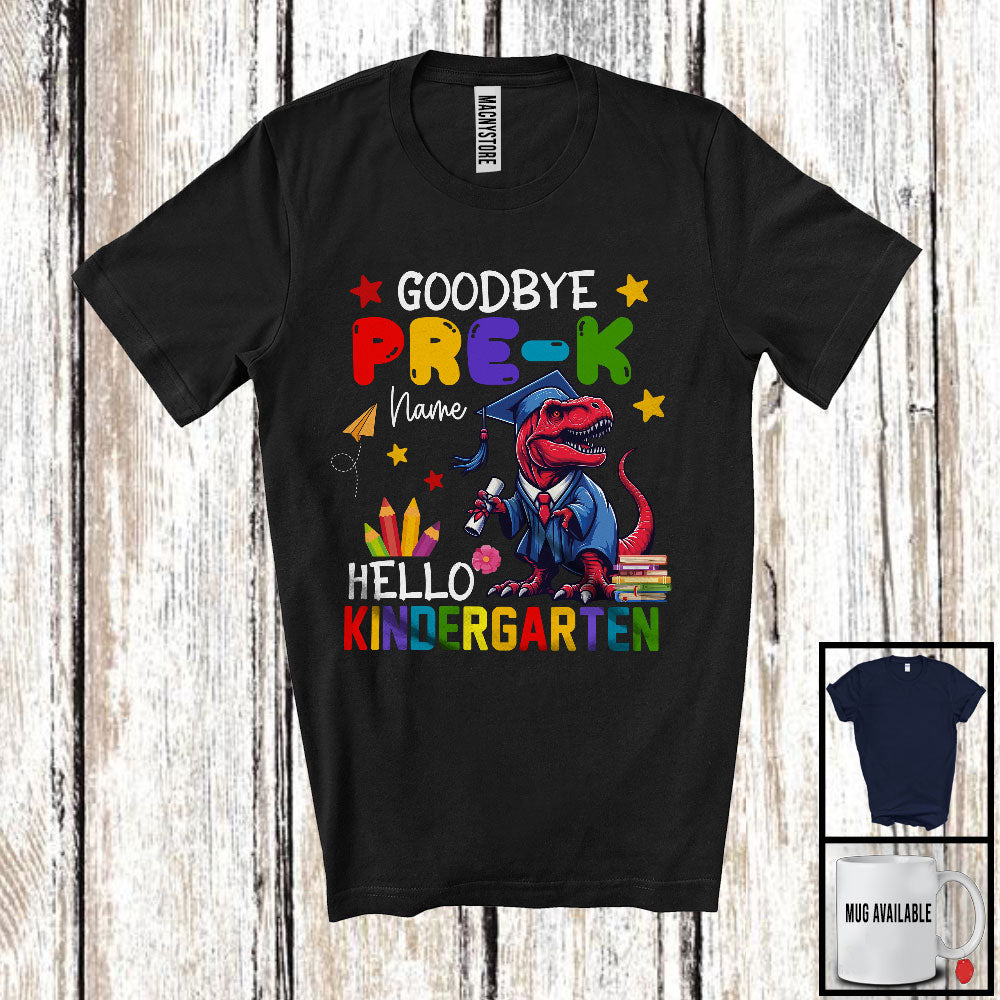 Personalized Goodbye Pre-K Hello Kindergarten, Joyful Summer Vacation T-Rex, Custom Name Graduate T-Shirt