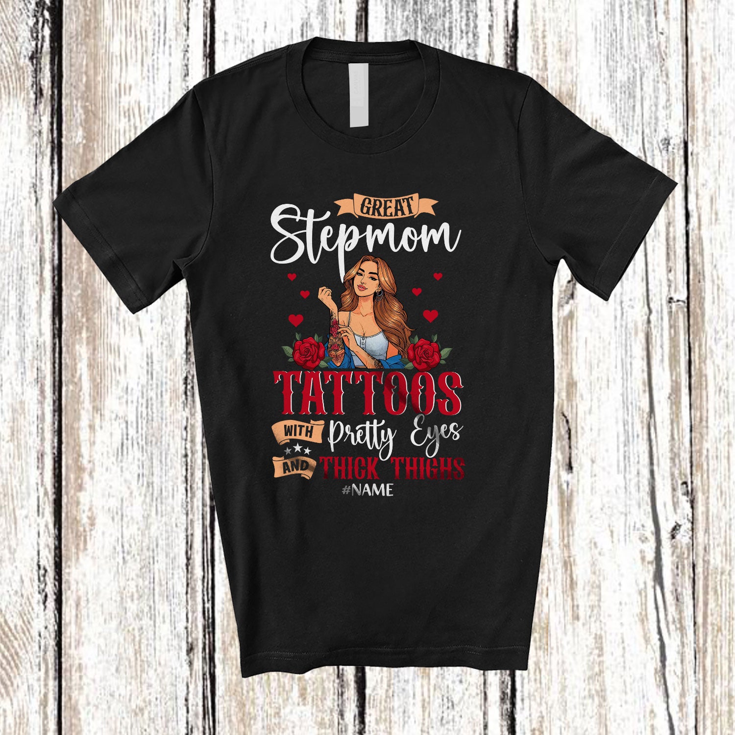 Personalized Great Stepmom With Tattoos Pretty Eyes; Amusing Mother's Day Custom Name Family T-Shirt. This cotton t-shirt is a durable staple product with a classic fit. One of the most popular items, it has a relaxed style made for everyday and casual wear.