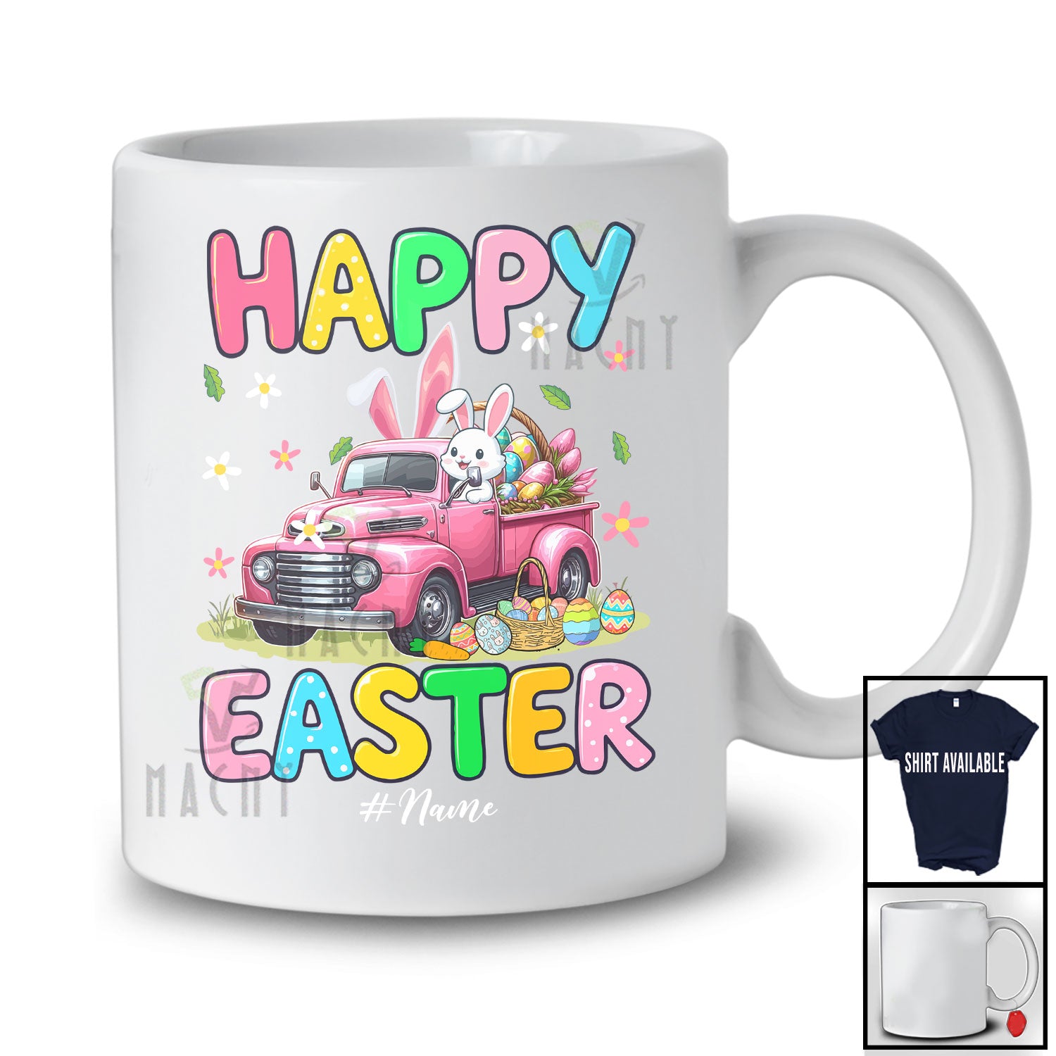 • Personalized Happy Easter; Adorable Bunny Driving Pickup Truck; Custom Name Driver Egg Hunting T-Shirt. This cotton t-shirt is a durable staple product with a classic fit. One of the most popular items, it has a relaxed style made for everyday and casual wear.