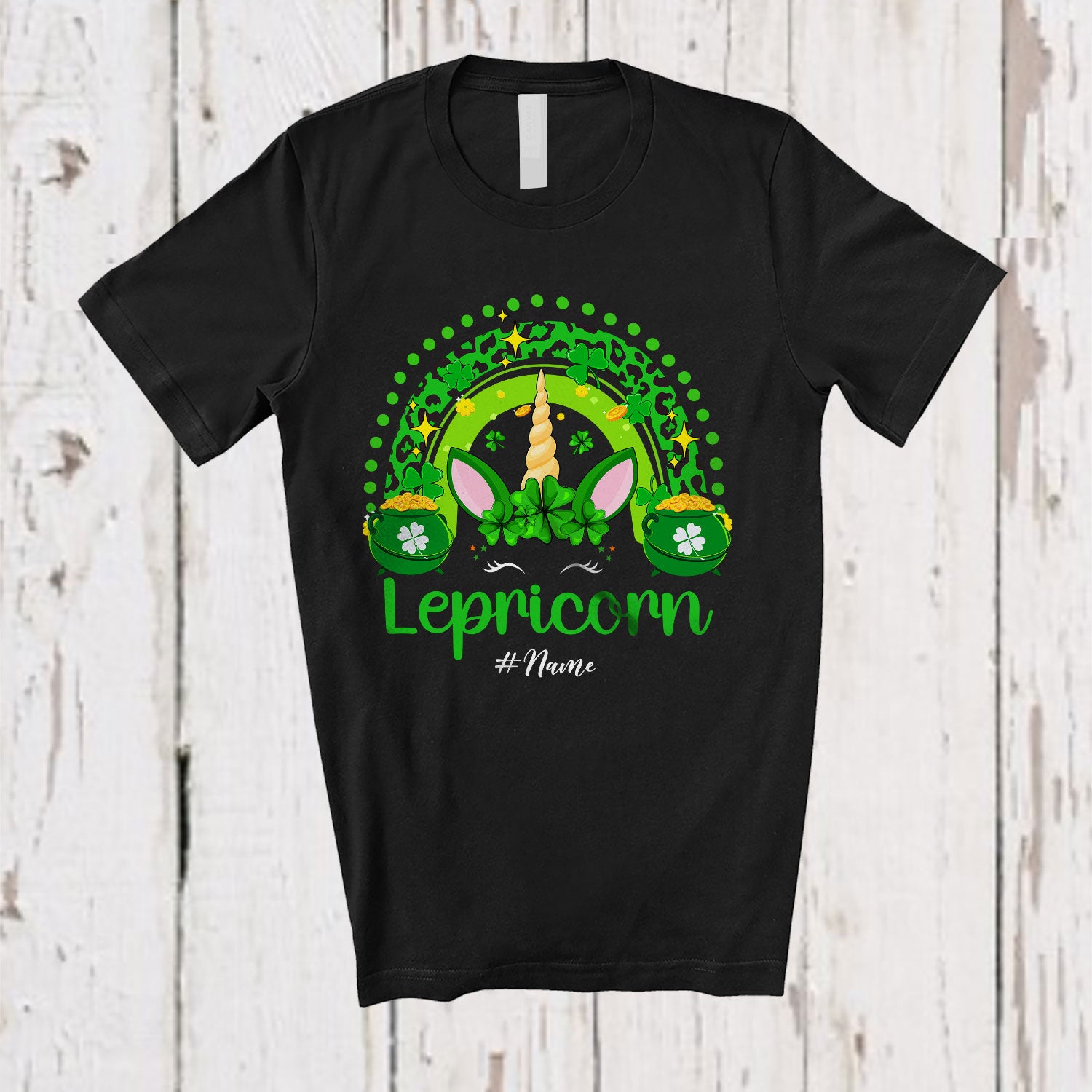 • Personalized Lepricorn; Lovely St. Patrick's Day Custom Name Unicorn Face Leprechaun; Family T-Shirt. This cotton t-shirt is a durable staple product with a classic fit. One of the most popular items, it has a relaxed style made for everyday and casual wear.