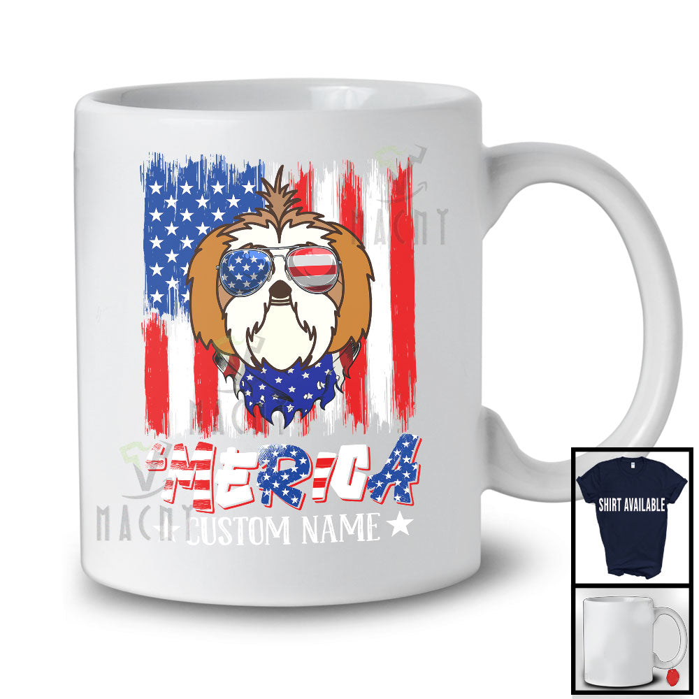 Personalized 'Merica, Proud 4th Of July Custom Name Shih Tzu Owner, USA Flag Patriotic T-Shirt. This cotton t-shirt is a durable staple product with a classic fit. One of the most popular items, it has a relaxed style made for everyday and casual wear.