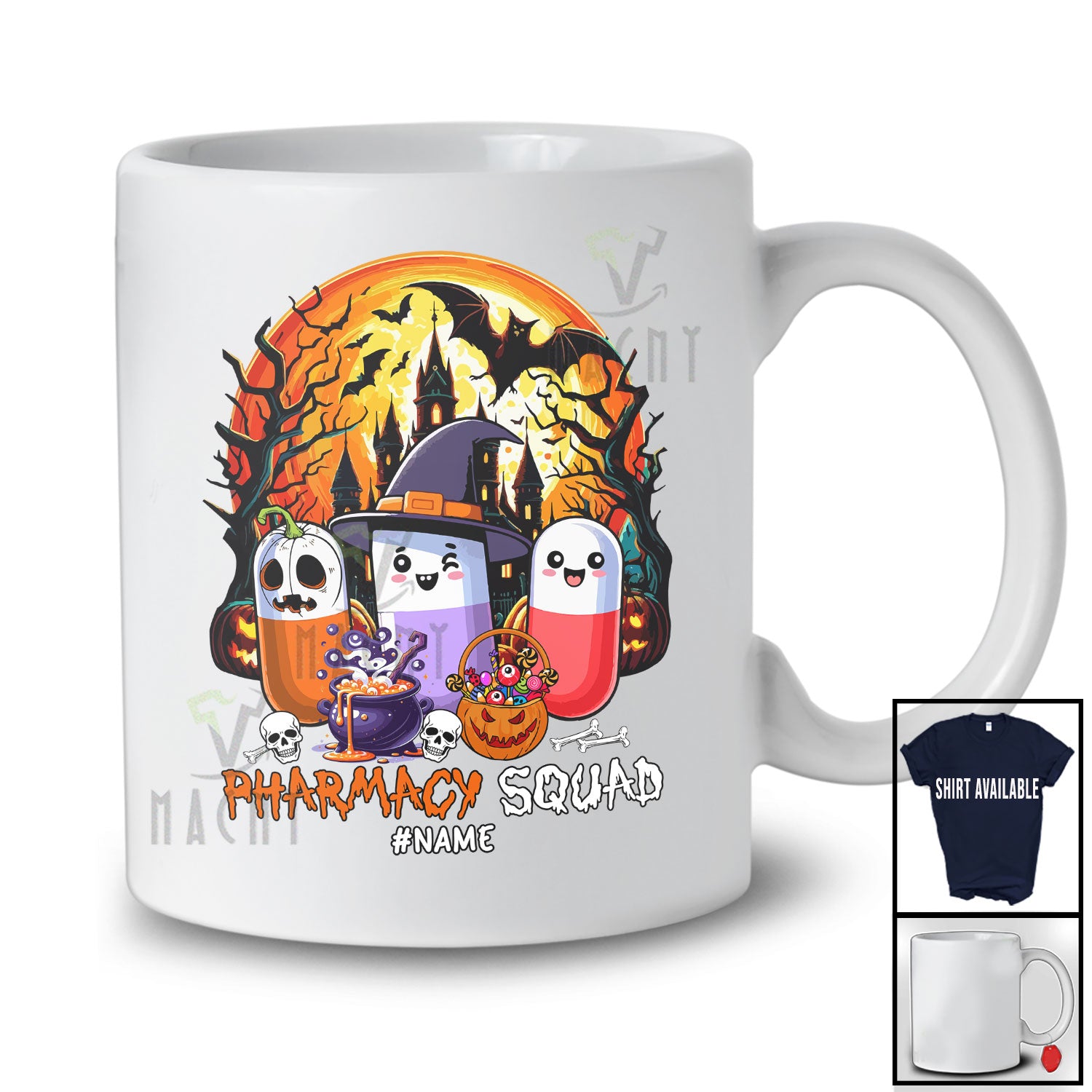 Personalized Pharmacy Squad; Scary Halloween Moon Three Pills; Custom Name Pharmacist T-Shirt. This cotton t-shirt is a durable staple product with a classic fit. One of the most popular items, it has a relaxed style made for everyday and casual wear.