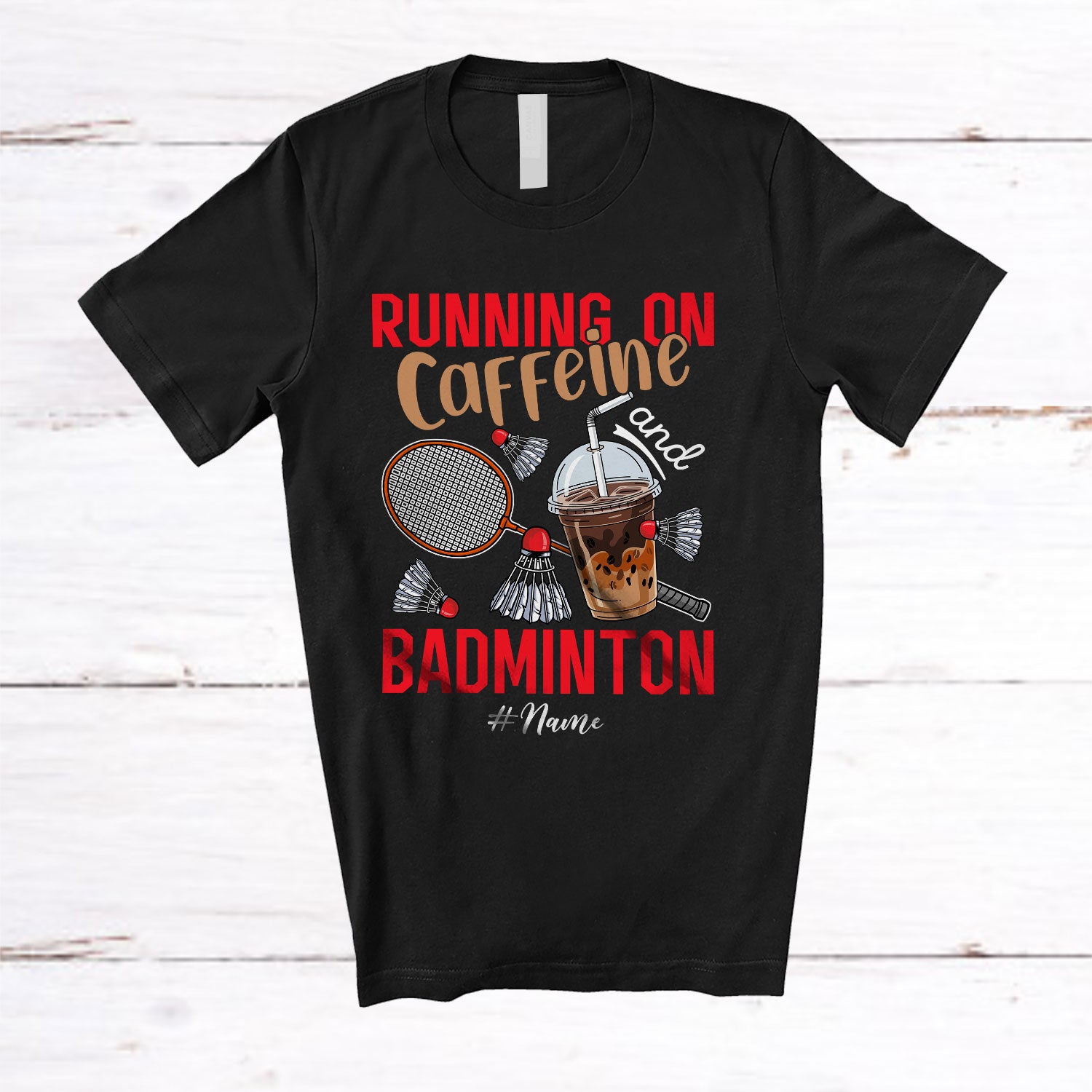 • Personalized Running On Caffeine And Badminton; Joyful Custom Name Coffee Badminton Player T-Shirt. This cotton t-shirt is a durable staple product with a classic fit. One of the most popular items, it has a relaxed style made for everyday and casual wear.