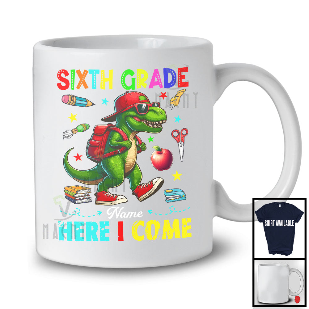 Personalized Sixth Grade Here I Come, Joyful First Day Of School T-Rex, Custom Name Dinosaur T-Shirt