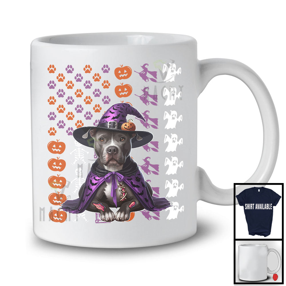 • Pit Bull Witch On American Flag, Adorable Halloween Pumpkin Paws, Patriotic Group T-Shirt. This cotton t-shirt is a durable staple product with a classic fit. One of the most popular items, it has a relaxed style made for everyday and casual wear.