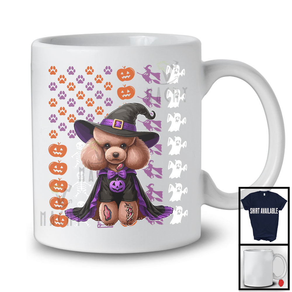 The Poodle Witch On American Flag, Adorable Halloween Pumpkin Paws, Patriotic Group T-Shirt destined to impress, and priced at only $12.95, for a limited time.