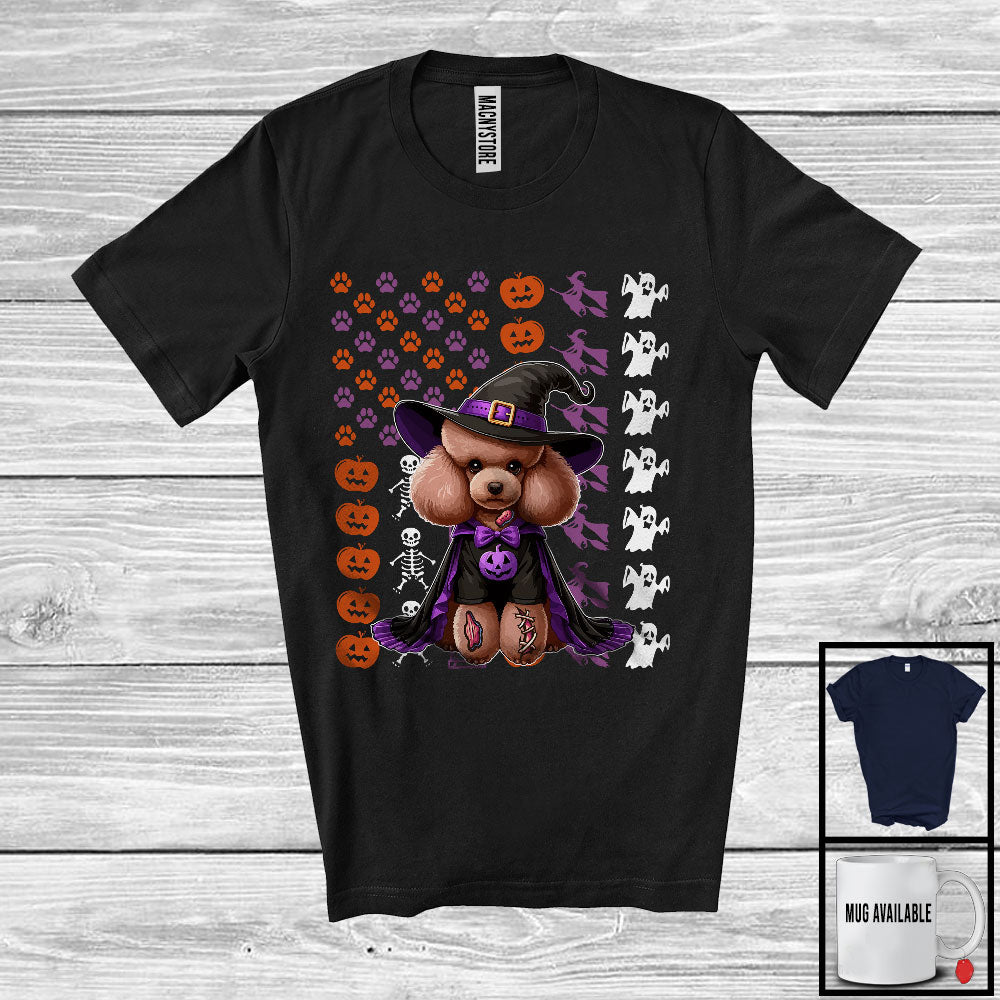 Poodle Witch On American Flag, Adorable Halloween Pumpkin Paws, Patriotic Group T-Shirt