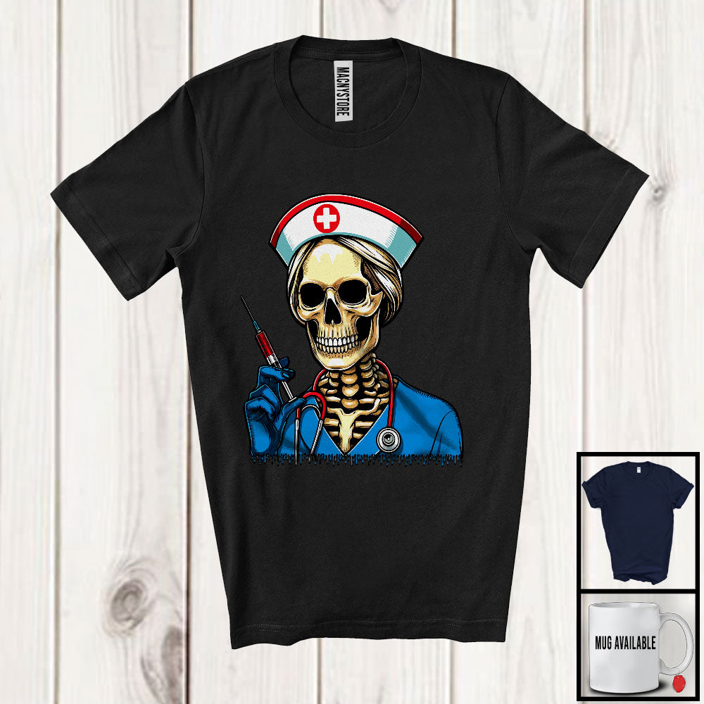 new MacnyStore - Skeleton Nurse, Scary Halloween Skeleton Holding Nurse Tools, Healthcare Jobs Nurse Group T-Shirt – Macnystore
