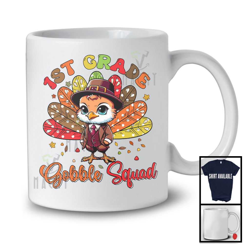 The 1st Grade Gobble Squad; Lovely Thanksgiving Turkey Fall Leaves; Proud Teacher Students Group T-Shirt destined to impress, and priced at only $12.95, for a limited time.