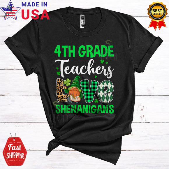 4th Grade Teachers Love Shenanigans Cute Funny St. Patrick's Day Leopard Plaid Irish Gnomes Lover T-Shirt