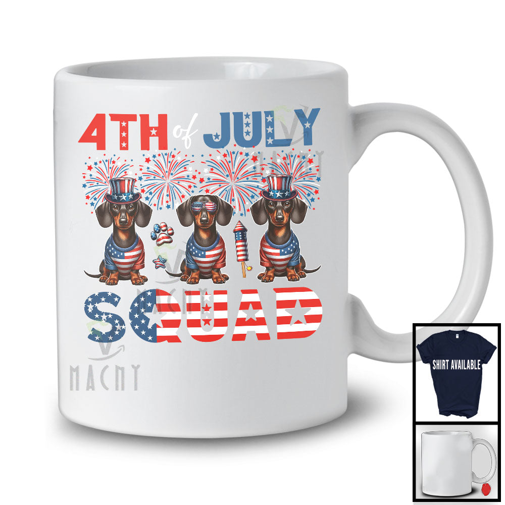 • 4th Of July Squad, Lovely Independence Day Three Dachshunds, USA Flag Fireworks Patriotic T-Shirt. This cotton t-shirt is a durable staple product with a classic fit. One of the most popular items, it has a relaxed style made for everyday and casual wear.