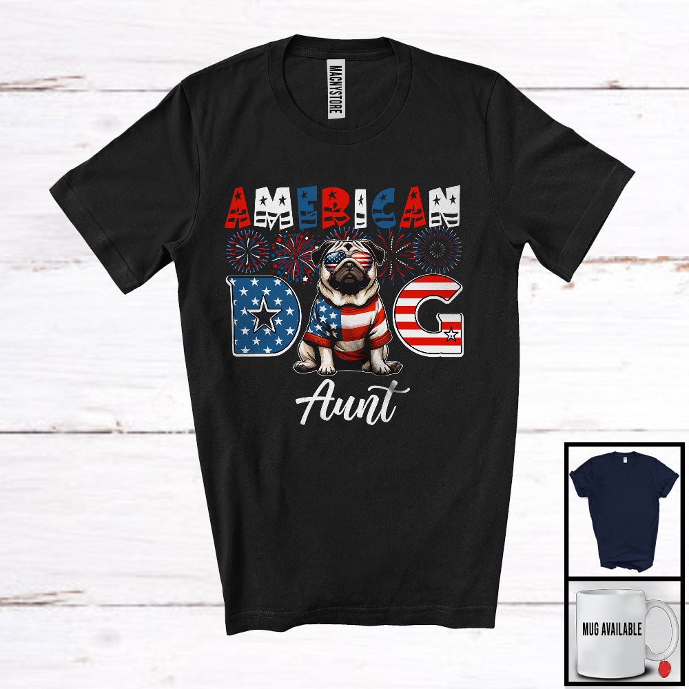 American Dog Aunt, Humorous 4th Of July American Flag Pug Owner, Fireworks Patriotic Family T-Shirt