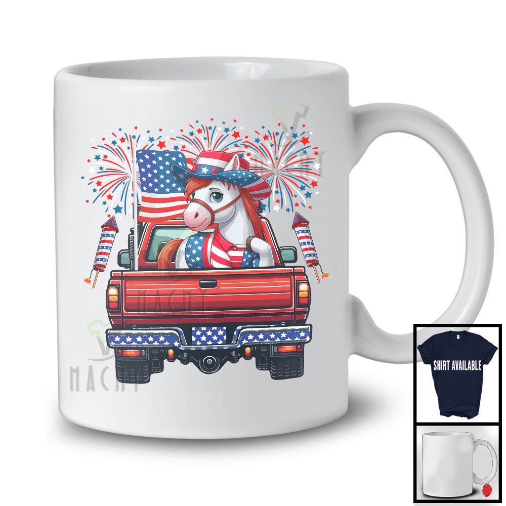 American Flag Horse On Pickup Truck, Cheerful 4th Of July Fireworks, Farm Animal Farmer Patriotic T-Shirt