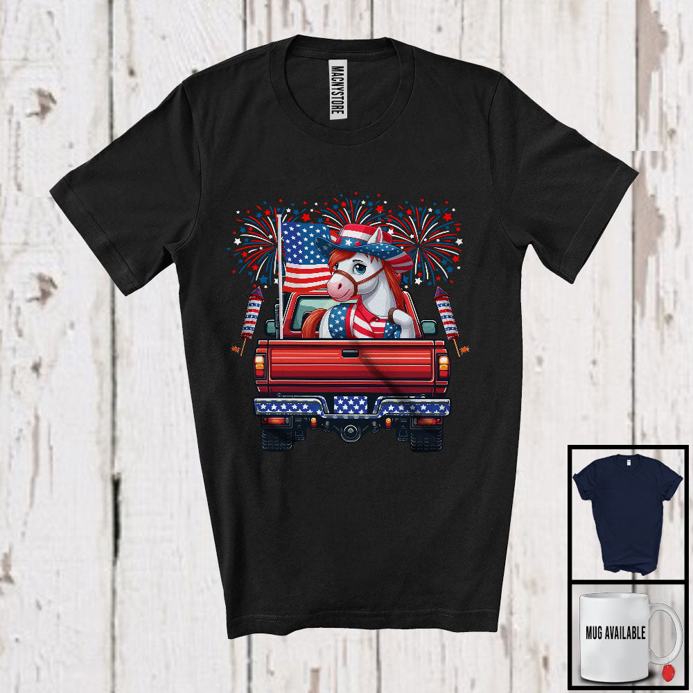 new MacnyStore - American Flag Horse On Pickup Truck, Cheerful 4th Of July Fireworks, Farm Animal Farmer Patriotic T-Shirt – Macnystore