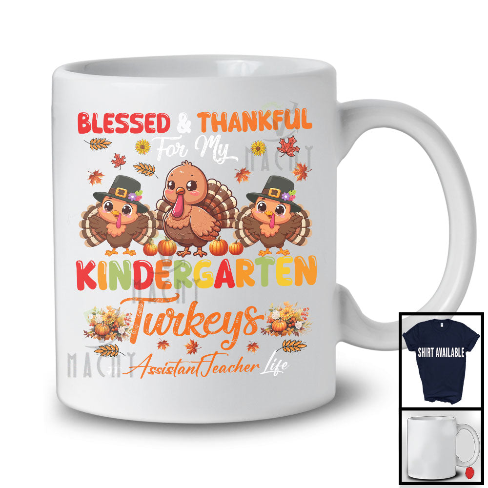 Blessed Thankful For My Kindergarten Turkeys Assistant Teacher, Happy Thanksgiving Fall Three Turkeys T-Shirt. This cotton t-shirt is a durable staple product with a classic fit. One of the most popular items, it has a relaxed style made for everyday and casual wear.