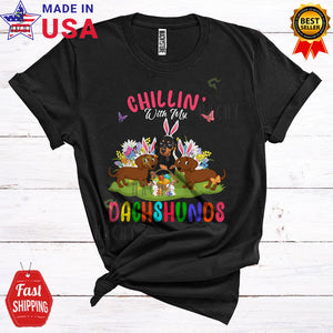 Chillin' With My Dachshunds Cute Happy Easter Three Bunny Dachshunds Hunting Eggs T-Shirt