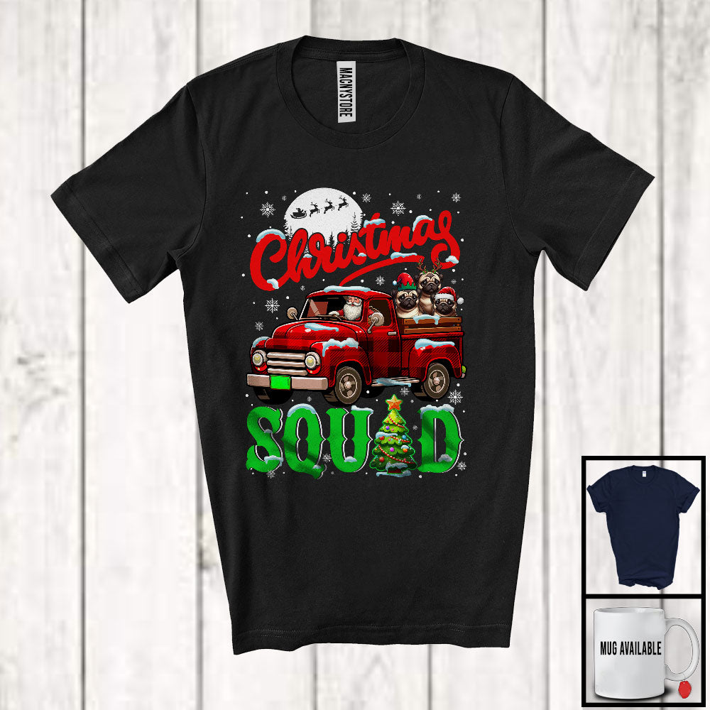 Christmas Squad; Adorable X-mas Santa Pug On Red Plaid Pickup Truck; Family Group T-Shirt. This cotton t-shirt is a durable staple product with a classic fit. One of the most popular items, it has a relaxed style made for everyday and casual wear.