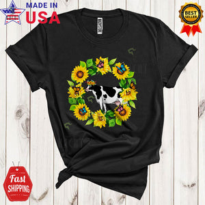 Cute Cow In Sunflowers Circle Cool Funny Animal Butterfly Gardener Farm Farmer T-Shirt