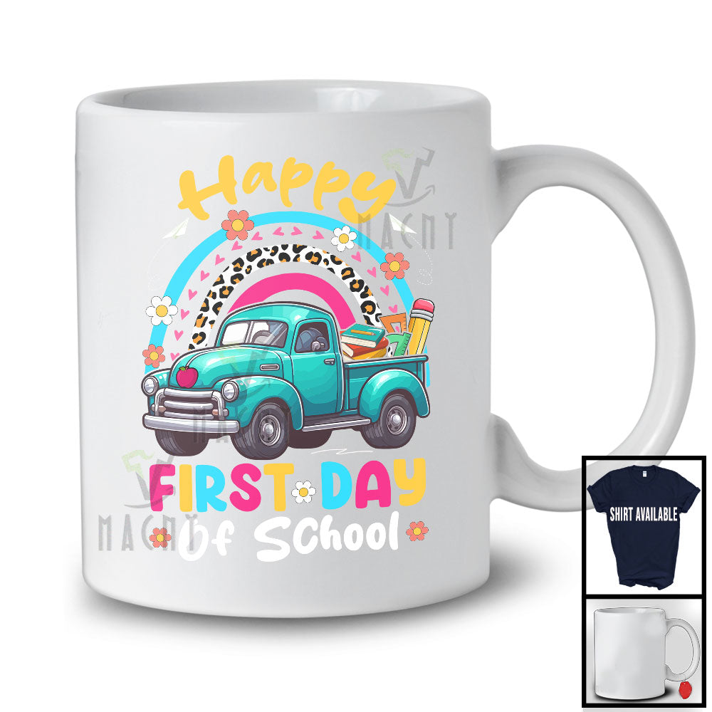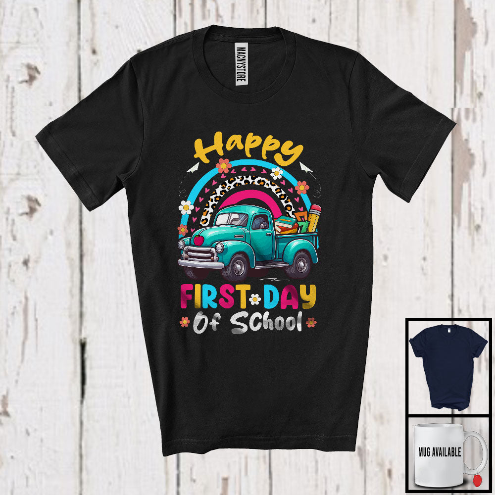 new MacnyStore - Happy First Day Of School, Adorable Pickup Truck Leopard Flowers Rainbow, Student Teacher T-Shirt – Macnystore