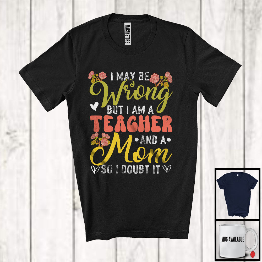I May Be Wrong But I Am A Teacher And A Mom, Awesome Mother's Day Flowers, Family T-Shirt. This cotton t-shirt is a durable staple product with a classic fit. One of the most popular items, it has a relaxed style made for everyday and casual wear.