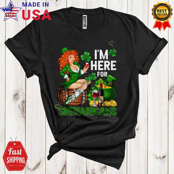 MacnyStore - I'm Here For Shenanigans Funny Cool St. Patrick's Day Irish Leprechaun Girl Drinking Wine Drunk Group T-Shirt