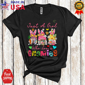 Just A Girl Who Loves Gnomies Cute Cool Easter Three Bunny Gnomes Carrot Eggs Group T-Shirt