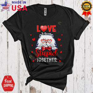 Love Is Being Stupid Together Cute Happy Valentine's Day Hearts Cat Animal Couple Lover T-Shirt