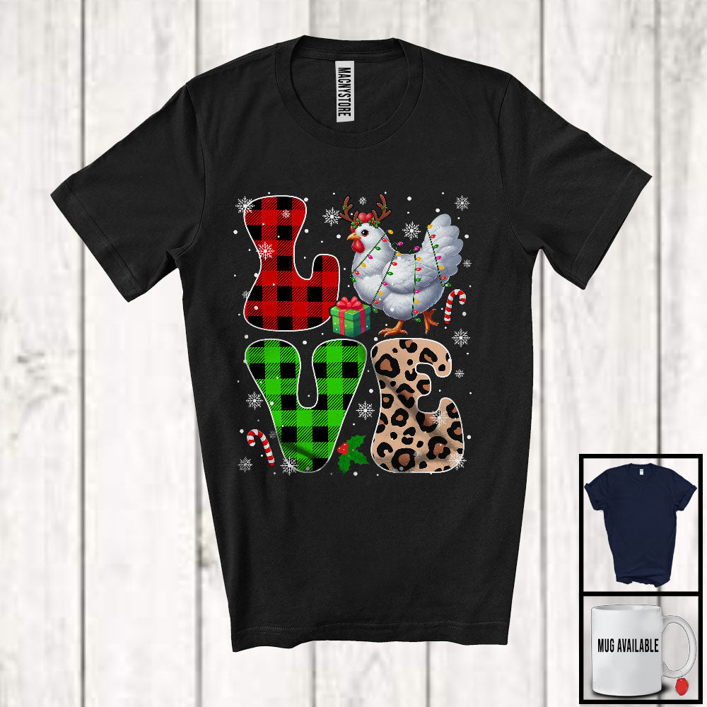LOVE; Lovely Christmas Lights Leopard Plaid Chickens; Matching Chickens Lover Family Group T-Shirt. This cotton t-shirt is a durable staple product with a classic fit. One of the most popular items, it has a relaxed style made for everyday and casual wear.