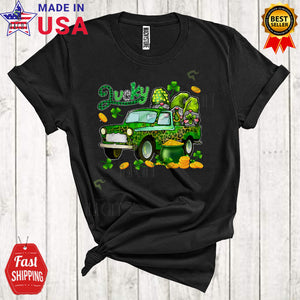 Lucky Funny Cool St. Patrick's Day Leopard Plaid Shamrock Three Gnomes On Pickup Truck Lover T-Shirt