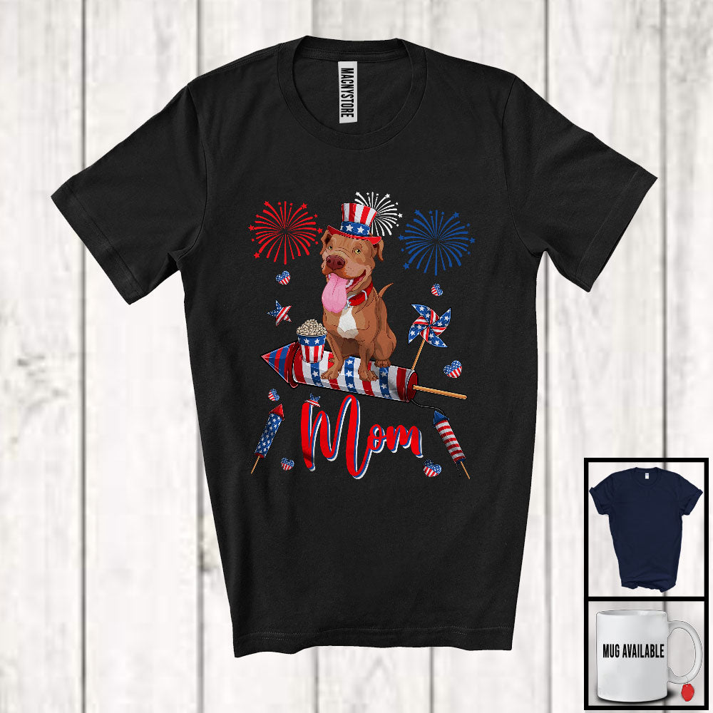Mom, Adorable Mother's Day 4th Of July Pit Bull With Fireworks, American Flag Patriotic T-Shirt