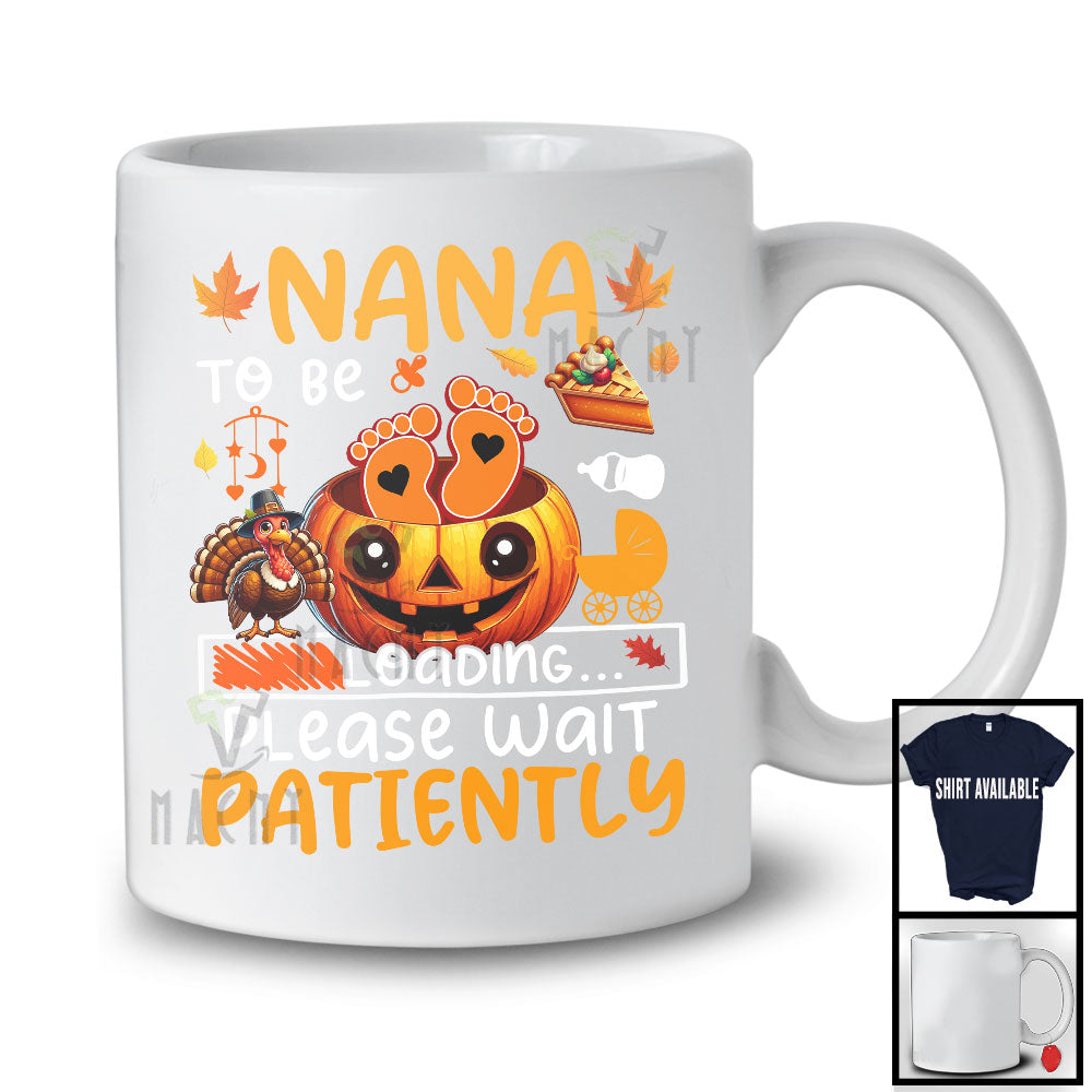 Nana To Be Please Wait Patiently; Lovely Thanksgiving Pregnancy Footprint Pumpkin; Family T-Shirt. This cotton t-shirt is a durable staple product with a classic fit. One of the most popular items, it has a relaxed style made for everyday and casual wear.