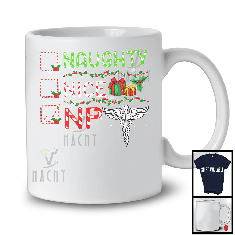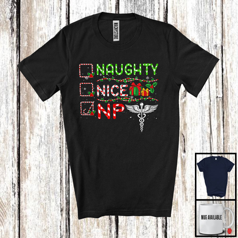 Naughty Nice NP; Cheerful Christmas Snowing Around Santa; Nurse Family Group T-Shirt. This cotton t-shirt is a durable staple product with a classic fit. One of the most popular items, it has a relaxed style made for everyday and casual wear.