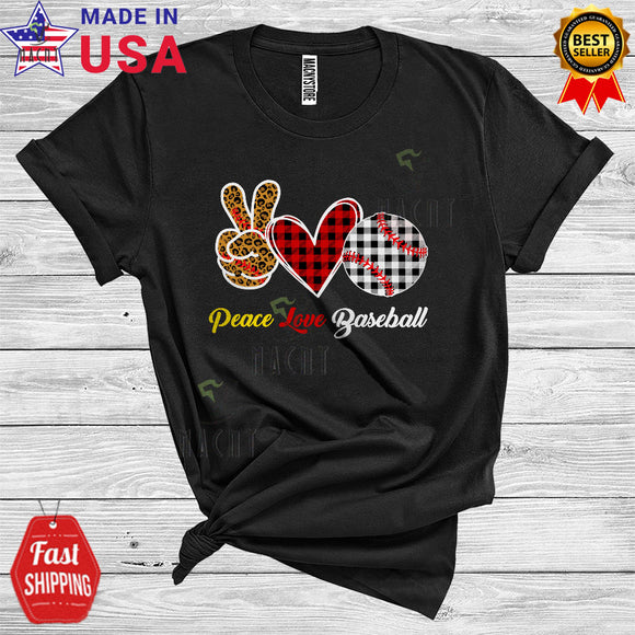 Peace Love Baseball Funny Cool Leopard Peace Hand Sign Plaid Hearts Baseball Playing Player T-Shirt