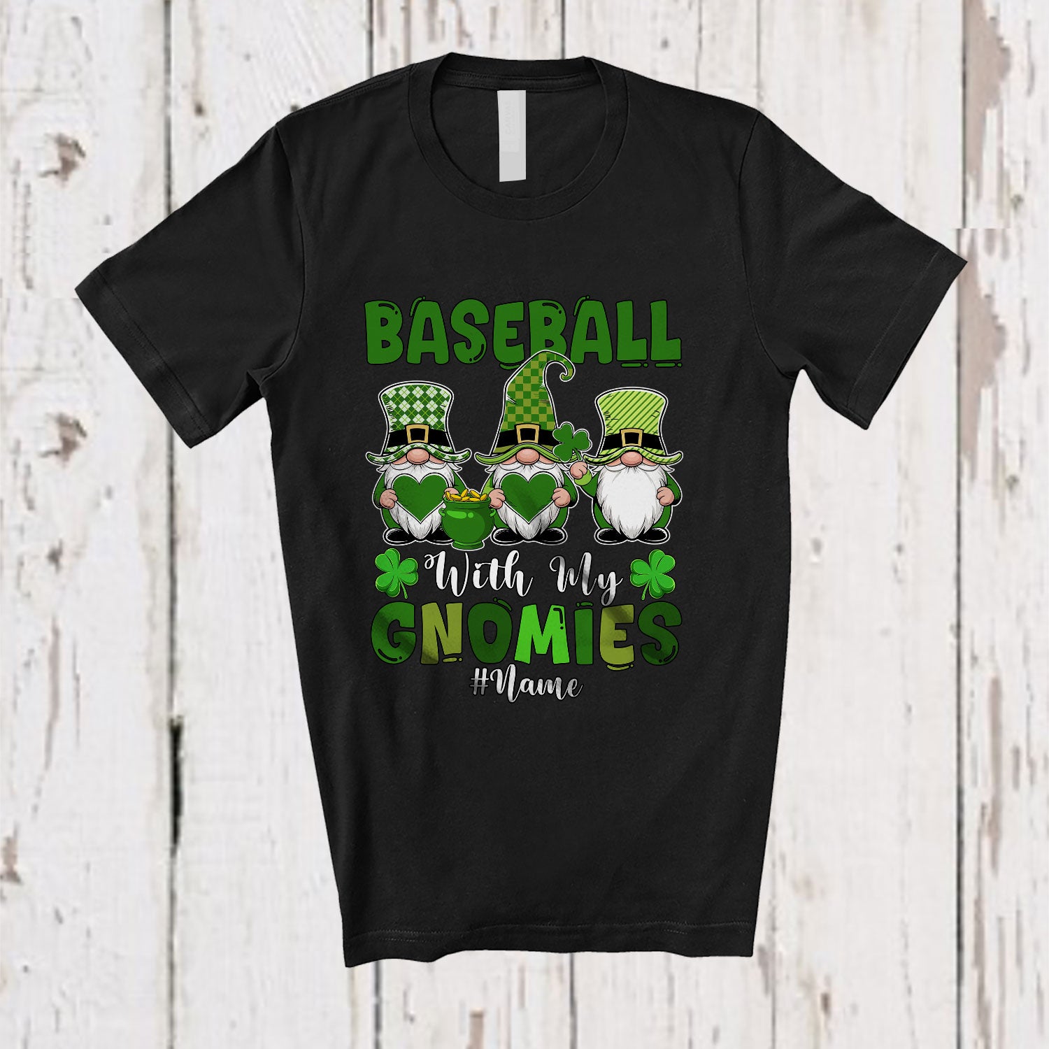 Personalized Baseball With My Gnomies; Lovely St. Patrick's Day Custom Name Three Green Gnomes T-Shirt. This cotton t-shirt is a durable staple product with a classic fit. One of the most popular items, it has a relaxed style made for everyday and casual wear.