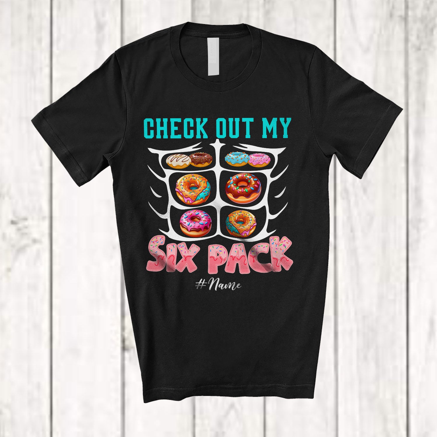 • Personalized Check Out My Six Pack; Joyful Custom Name Gym Workout; Donuts Food Lover T-Shirt. This cotton t-shirt is a durable staple product with a classic fit. One of the most popular items, it has a relaxed style made for everyday and casual wear.