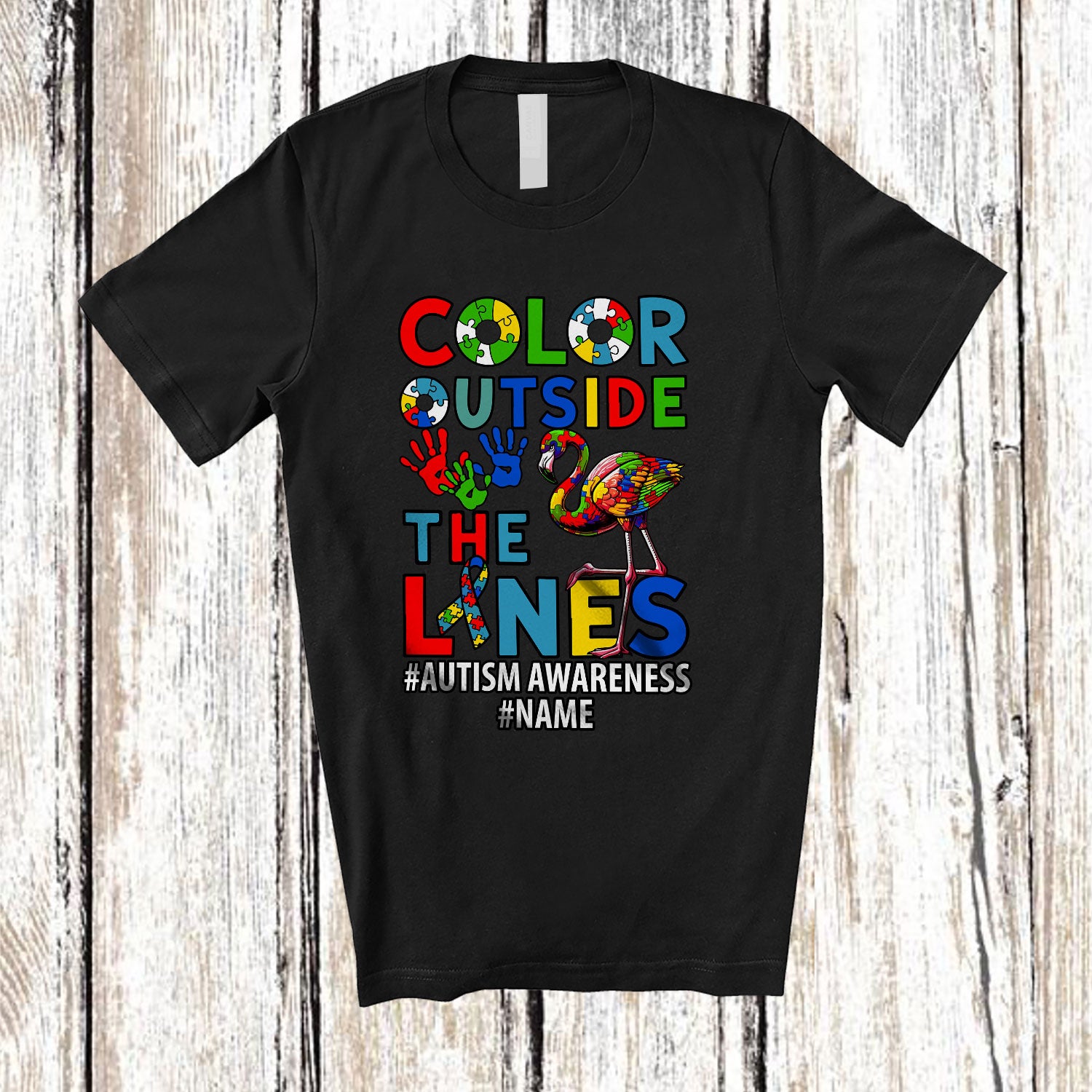 new MacnyStore - Personalized Color Outside The Line; Humorous Autism Custom Name Puzzle Ribbon Flamingo T-Shirt – Macnystore