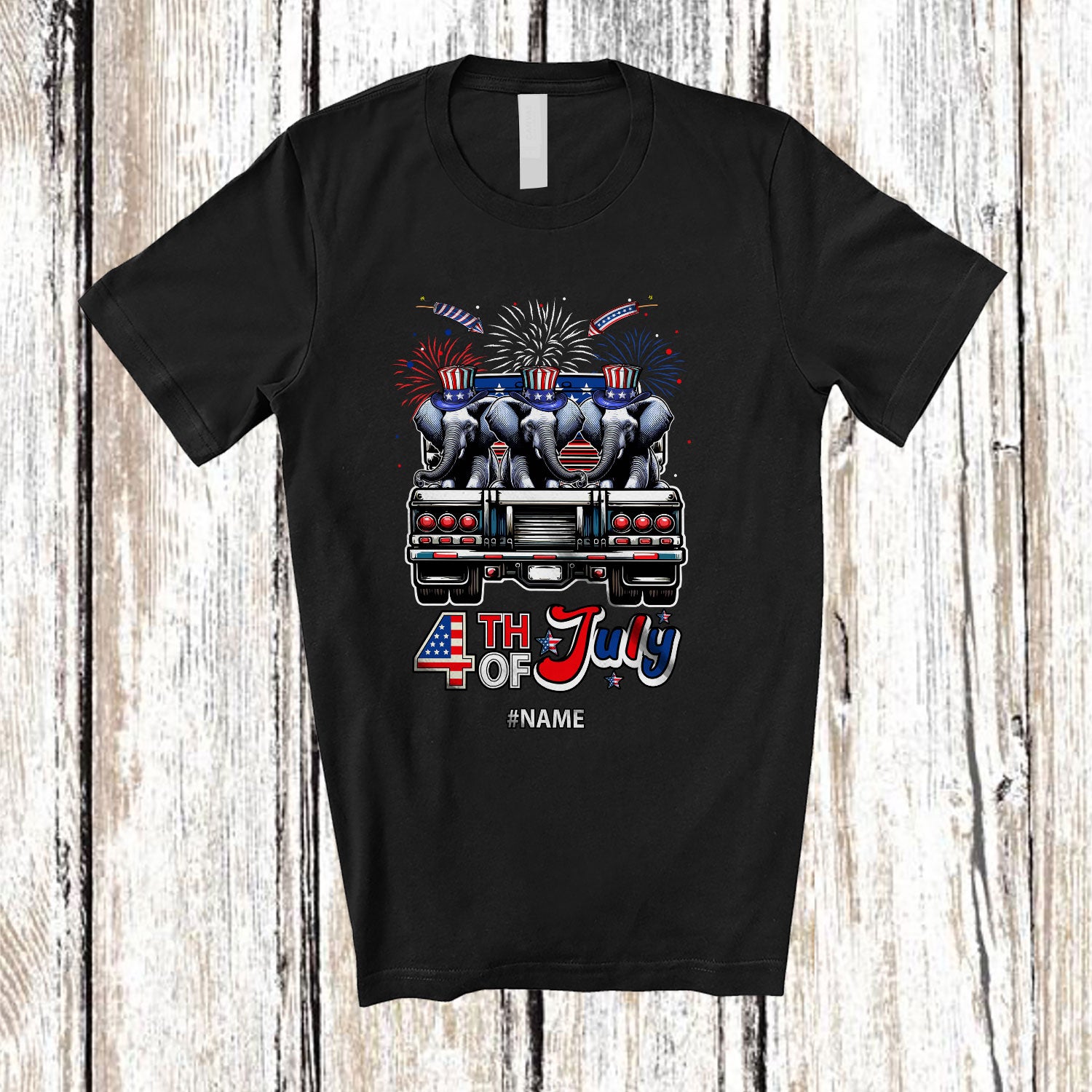 Personalized Custom Name 4th of July; Lovely Three US Flag Elephant On Truck; Patriotic T-Shirt
