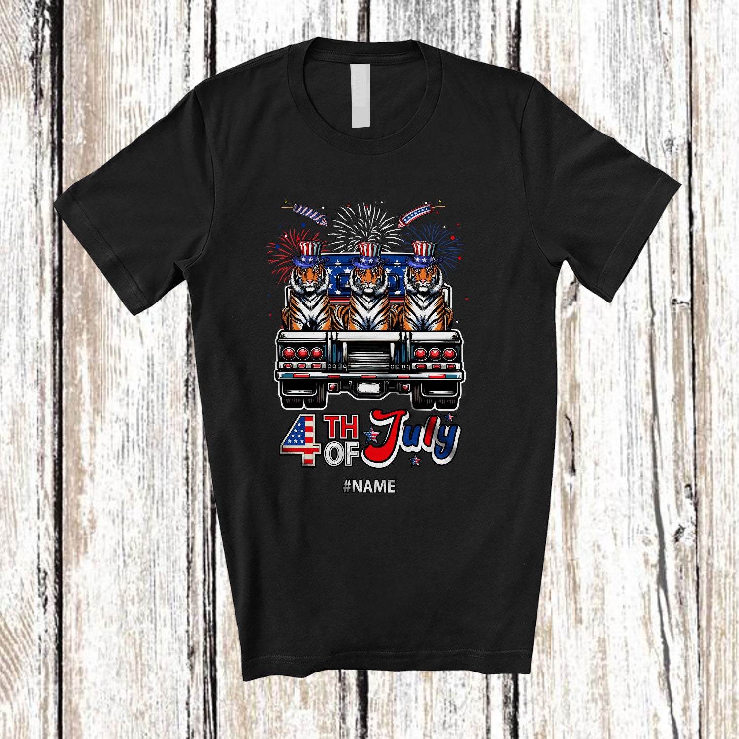 Personalized Custom Name 4th of July; Lovely Three US Flag Tiger On Truck; Patriotic T-Shirt. This cotton t-shirt is a durable staple product with a classic fit. One of the most popular items, it has a relaxed style made for everyday and casual wear.
