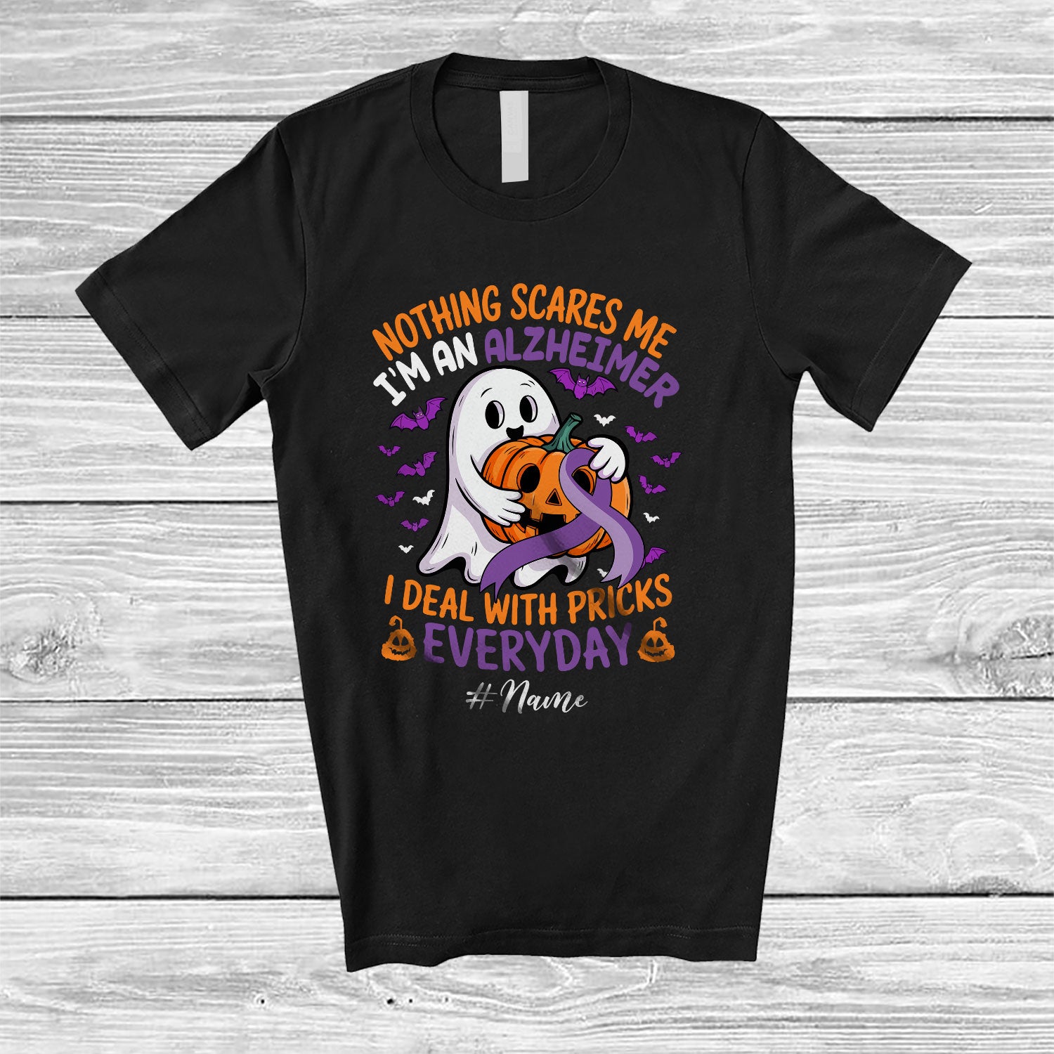 • Personalized Custom Name Alzheimer Deal With Pricks; Scary Halloween Purple Ribbon Boo Ghost T-Shirt. This cotton t-shirt is a durable staple product with a classic fit. One of the most popular items, it has a relaxed style made for everyday and casual wear.