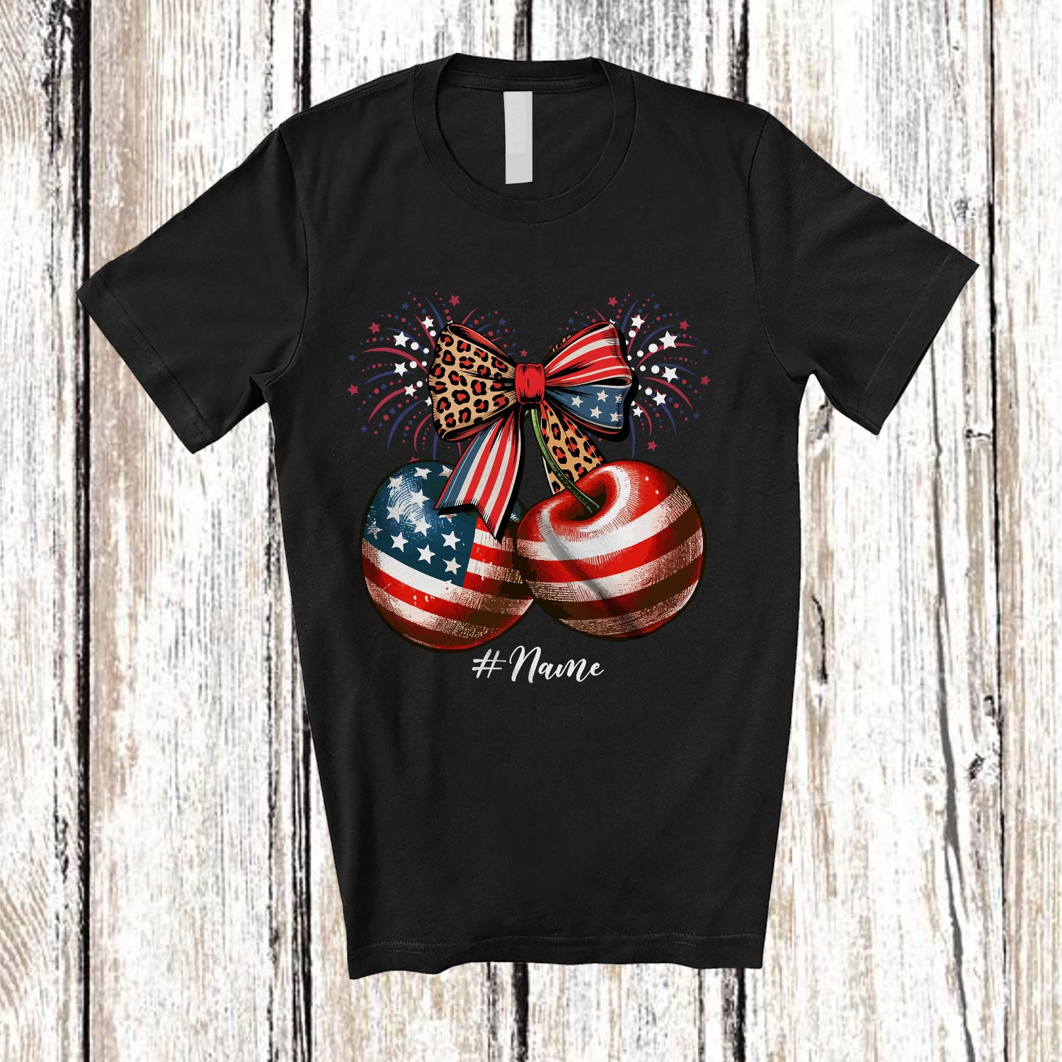 Personalized Custom Name America Cherries Leopard Bow; Amazing 4th of July Woman Patriotic T-Shirt