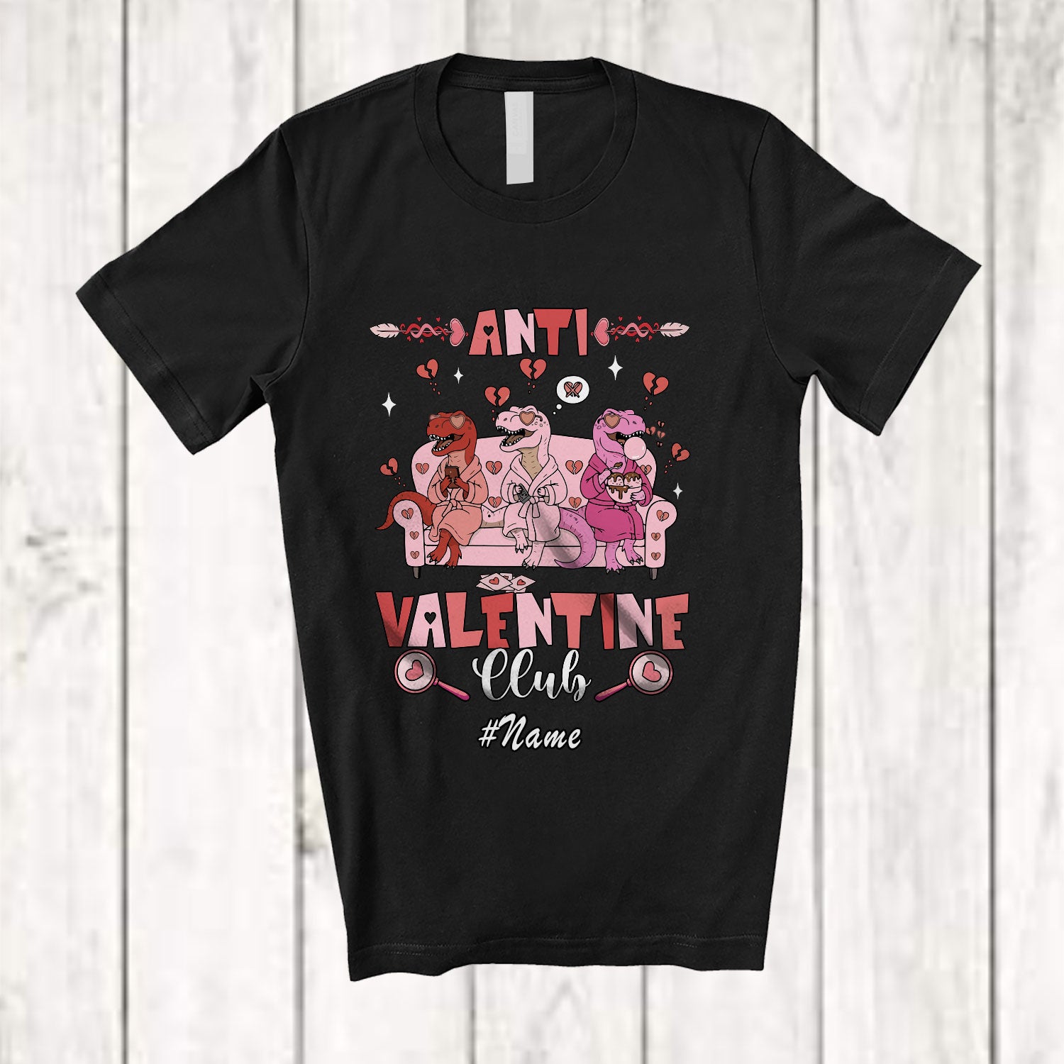 • Personalized Custom Name Anti Valentine Club; Humorous Three Pink T-Rex Dinosaur Lover T-Shirt. This cotton t-shirt is a durable staple product with a classic fit. One of the most popular items, it has a relaxed style made for everyday and casual wear.