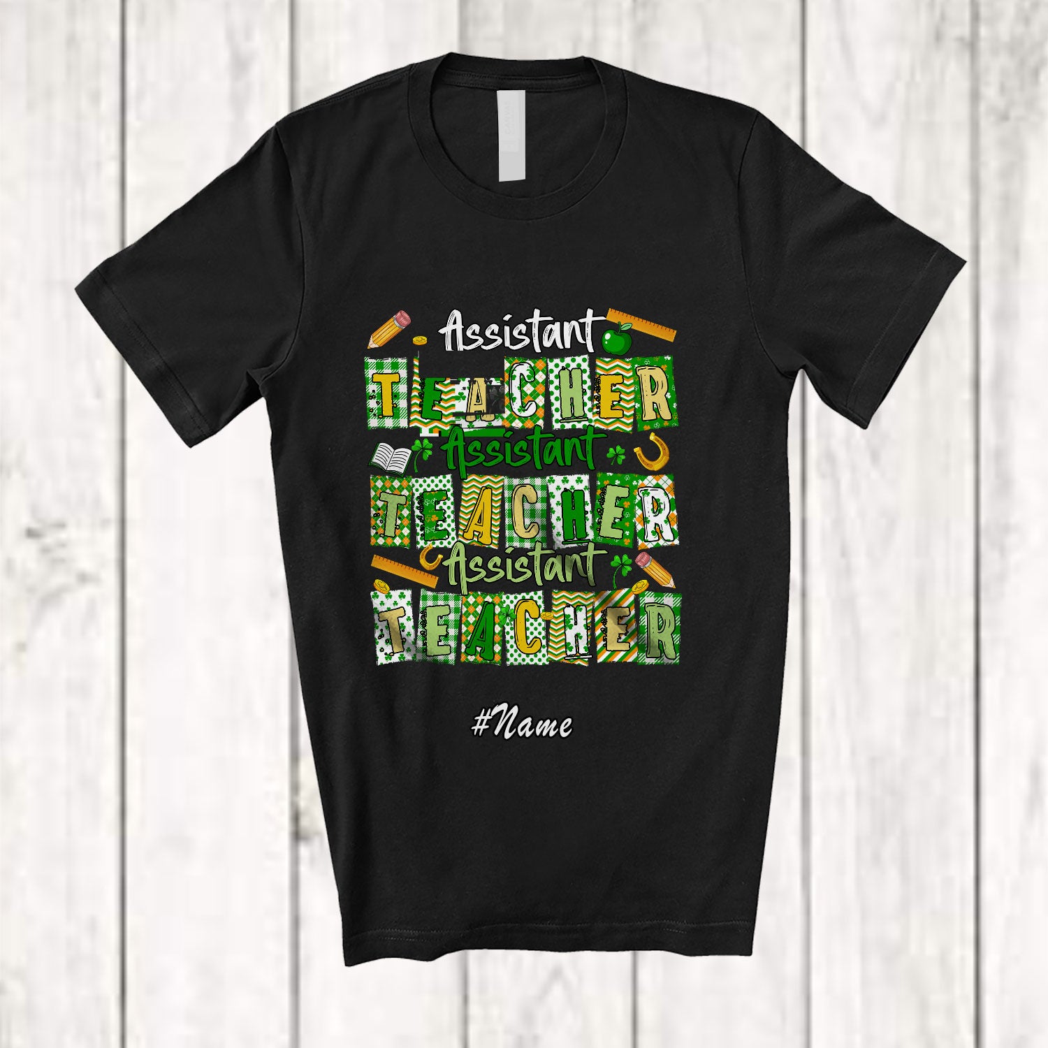 Personalized Custom Name Assistant Teacher; Proud St. Patrick's Day Plaid Shamrock; Women Jobs T-Shirt. This cotton t-shirt is a durable staple product with a classic fit. One of the most popular items, it has a relaxed style made for everyday and casual wear.