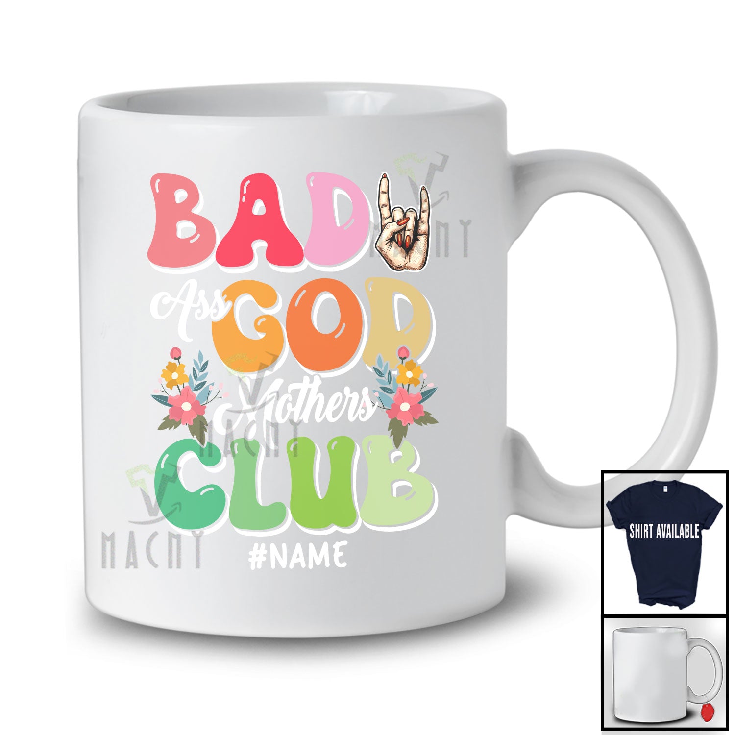 • Personalized Custom Name Bad Ass Godmothers Club; Proud Mother's Day Flower Rock Hand Sign T-Shirt. This cotton t-shirt is a durable staple product with a classic fit. One of the most popular items, it has a relaxed style made for everyday and casual wear.