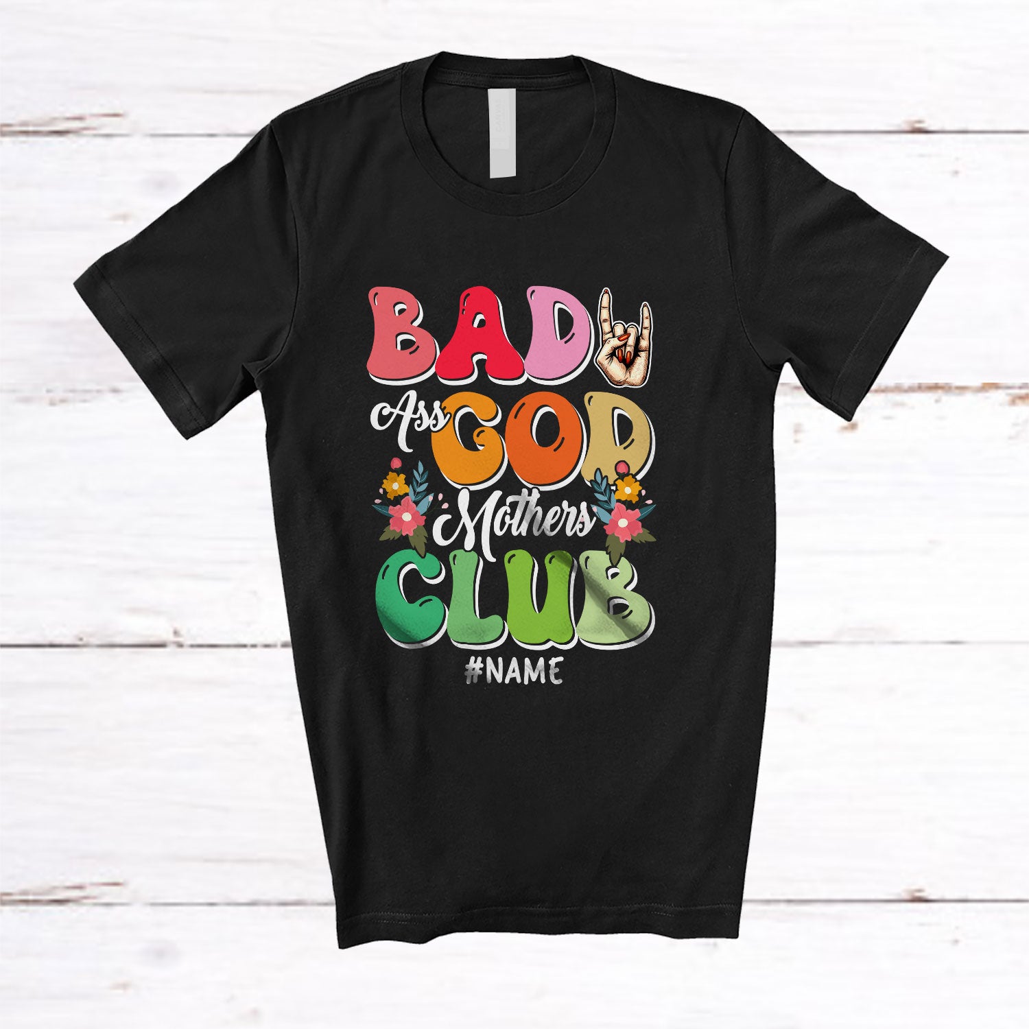Personalized Custom Name Bad Ass Godmothers Club; Proud Mother's Day Flower Rock Hand Sign T-Shirt