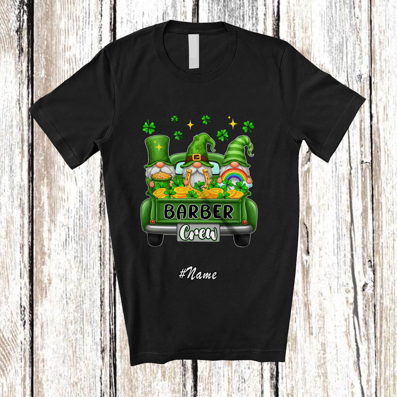 Personalized Custom Name Barber Crew; Lovely St. Patrick's Day Three Gnomes On Pickup Truck T-Shirt. This cotton t-shirt is a durable staple product with a classic fit. One of the most popular items, it has a relaxed style made for everyday and casual wear.